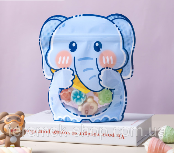 Пакет фігурний Слоненя дитяче з малюнком із зіп застібкою 18х16 см упаковка для солодощів об'ємне дно (корисна висота 12х13 см)